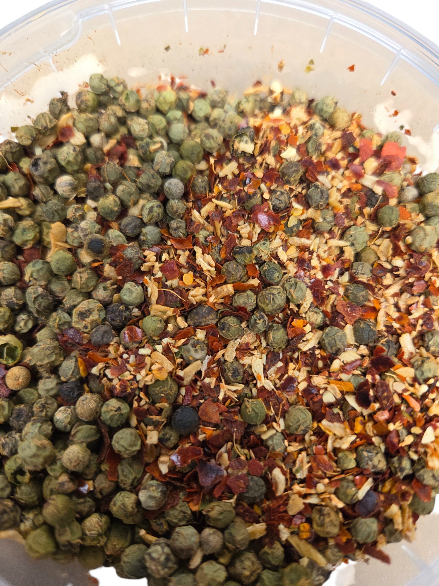 Geniet van de rijke, aromatische smaak die onze ambachtelijke Groene Peper, Ui en Knoflook Melange toevoegt aan jouw zelfgemaakte kazen!