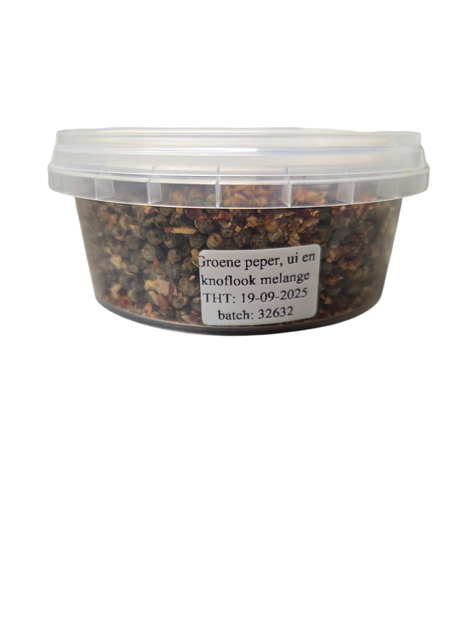 Duik in de wereld van smaakvolle kaasbereiding met onze ambachtelijk samengestelde Groene peper, ui en knoflook melange. Deze exclusieve mix voegt een ongeëvenaarde smaakdimensie toe aan jouw kaascreaties, waarbij de pittige kick van groene peper, de zoete tonen van ui en de rijke aroma's van knoflook samenkomen.