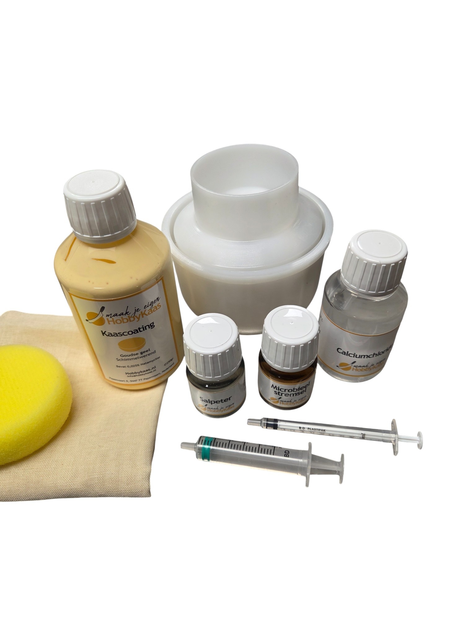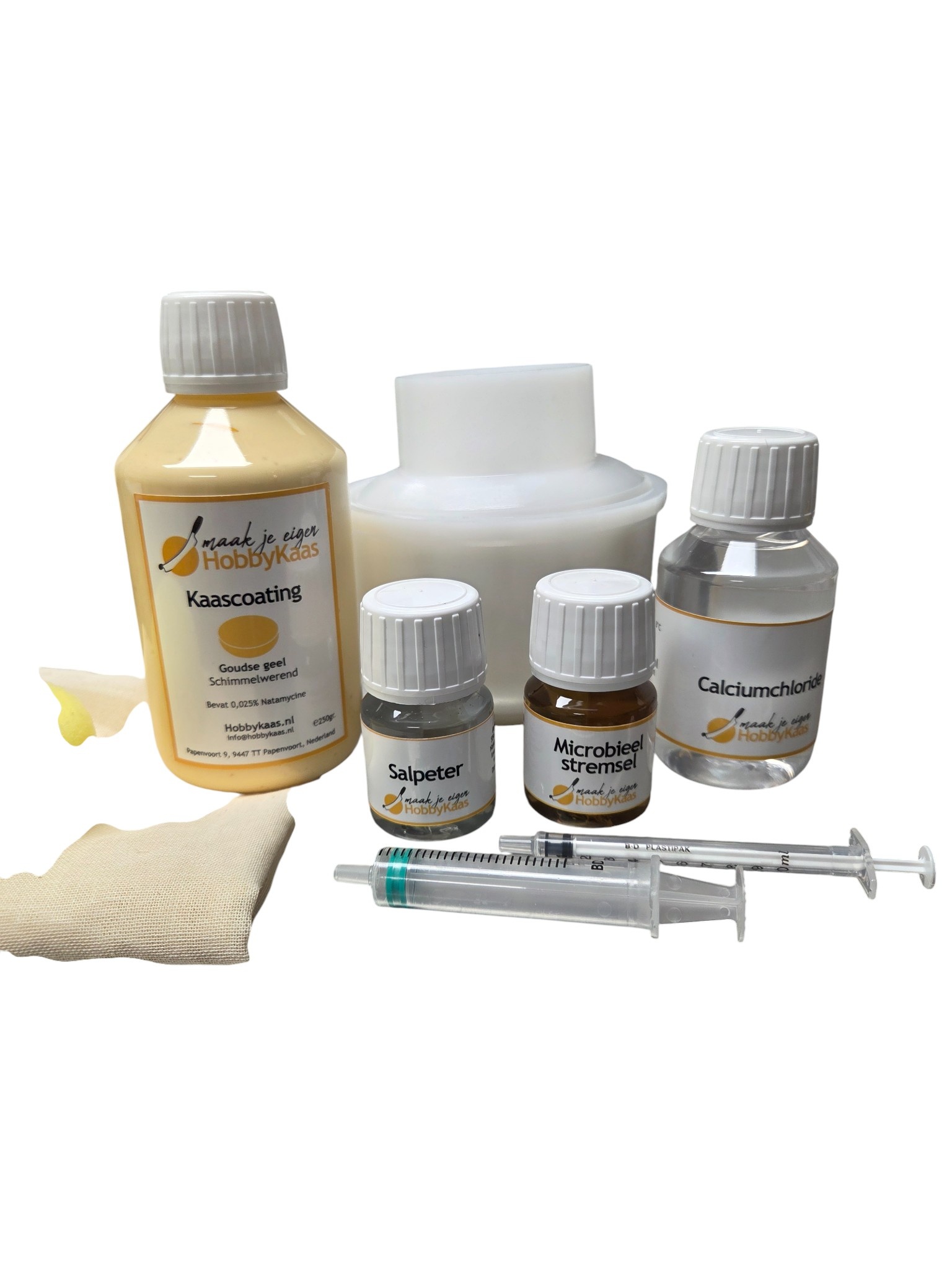 Onze kaasmaakset is samengesteld om je alle benodigdheden te bieden om je eerste kaasbereiding tot een succes te brengen. Bij de aankoop van een probeer of starter kit is het belangrijk dat deze calciumchloride bevat. Dit is een noodzakelijke vloeistof om goed kaas te kunnen maken.
